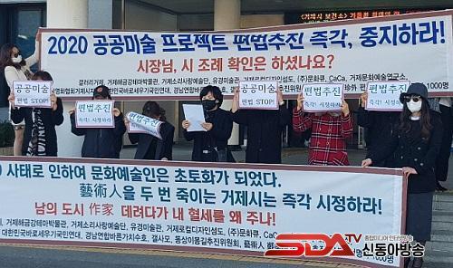 °ÅÁ¦ Áö¿ª 10¿© °³ ¹®È¡¤¿¹¼ú ±â°ü¡¤´Üü´Â 12ÀÏ °ÅÁ¦½Ãû ¾Õ¿¡¼ ±âÀÚȸ°ßÀ» ¿°í "°ÅÁ¦½Ã´Â Áï°¢ °ø°ø¹Ì¼ú ÇÁ·ÎÁ§Æ®¸¦ Áß´ÜÇÏ°í ¿øÁ¡¿¡¼ °øÁ¤ÇÏ°Ô ´Ù½Ã °ø°í¡¤°ø¸ð¡¤½ÉÀÇÇ϶ó"¶ó°í ¿ä±¸Çß½À´Ï´Ù.