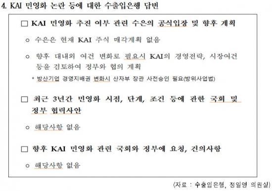¼öÃâÀÔÀºÇàÀº ÀÚ·á¿¡¼­ ¡°ÇöÀç KAI ÁÖ½Ä ¸Å°¢ °èȹÀº ¾ø´Ù¡±¸ç, ¡°ÇâÈÄ ´ë³»¿Ü ¿©°Ç º¯È­¿¡ µû¶ó ÇÊ¿ä½Ã KAIÀÇ °æ¿µÀü·«°ú ½ÃÀå »óȲÀ» °ËÅäÇØ Á¤ºÎ¿Í ÇùÀÇÇÒ °Í¡±À̶ó°í ¹àÇû´Ù. ƯÈ÷ ÃÖ±Ù 3³â°£ ¹Î¿µÈ­ ½ÃÁ¡¡¤´Ü°è¡¤Á¶°Ç µî¿¡ ´ëÇØ ±¹È¸³ª Á¤ºÎ¿Í ÇùÀÇÇÑ »ç·Ê°¡ ÀüÇô ¾ø¾ú°í, ¾ÕÀ¸·Î ¹Î¿µÈ­ °ü·Ã ¿äûÀ̳ª °ÇÀÇ»çÇ×µµ ¾ø´Â °ÍÀ¸·Î È®ÀεƴÙ.