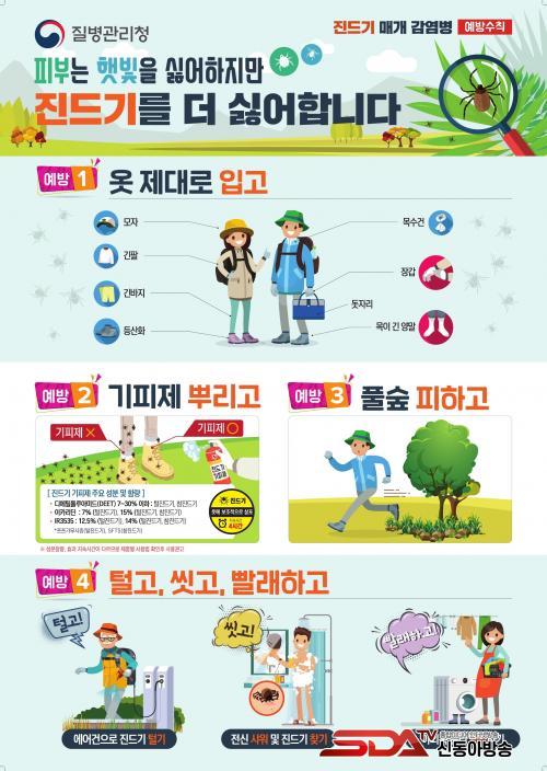 Áøµå±â ¸Å°³ °¨¿°º´ ¿¹¹æÀ» À§Çؼ­´Â ¡ã¾ß¿Ü Ȱµ¿ ½Ã Áøµå±â ±âÇÇÁ¦ »ç¿ë ¹× ±ä¼Ò¸Å¡¤±ä¹ÙÁö¡¤¸ðÀÚ µî Âø¿ëÀ¸·Î ÇǺΠ³ëÃâ ÃÖ¼ÒÈ­ ¡ã¾ß¿ÜȰµ¿ ÈÄ Áï½Ã »þ¿ö ¹× ¿Ê °¥¾ÆÀԱ⠡ã¾ó±¼, ±Í, ¸öÅë µî¿¡ Áøµå±â ºÎÂø ¿©ºÎ È®ÀÎ µîÀÇ ¼öÄ¢À» ÁöÄÑ¾ß ÇÑ´Ù.