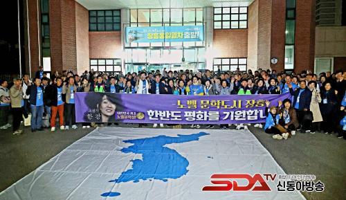 10¿ù 23ÀÏ(¸ñ) ¿ÀÈÄ2½Ã¿¡´Â °ü»êÀ¾ »ï»ê¹æÁ¶Á¦¿¡¼­¡®ÅëÀÏ¿°¿ø °È±â´ëȸ¡¯°¡ ¿­¸°´Ù. ±º¹Î 350¿© ¸íÀÌ ÆòÈ­ÀÇ »ó¡±æÀ» µû¶ó °È´Â´Ù. ÇöÀå¿¡¼­´Â ÅëÀÏÀ½¾Çȸµµ ÇÔ²² ¿­·Á ÅëÀÏÀÇ ¸Þ½ÃÁö¸¦ ³ë·¡·Î ÀüÇÑ´Ù.