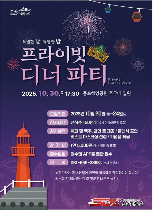 [½Åµ¿¾Æ¹æ¼Û ¿©¼ö=±è±â³² ±âÀÚ] ¿©¼ö½Ã(½ÃÀå Á¤±â¸í)´Â ¿À´Â 10¿ù 30ÀÏ Á¾Æ÷ÇØ¾ç°ø¿ø ÁÖ¹«´ë ÀÏ¿ø¿¡¼­ ¡®Æ¯º°ÇÑ ³¯, Ưº°ÇÑ ¹ã ÇÁ¶óÀ̺ø µð³Ê ÆÄƼ¡¯¸¦ °³ÃÖÇÑ´Ù. ÀÌ¿¡ ¾Õ¼­ ½Ã´Â 20ÀϺÎÅÍ 24ÀϱîÁö 5Àϰ£ Âü°¡ÀÚ 150¸íÀ» ¼±Âø¼øÀ¸·Î ¸ðÁýÇÑ´Ù.