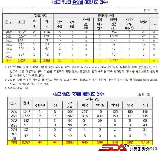 [½Åµ¿¾Æ¹æ¼Û ÀÎõ=À±¹Î½Ä±âÀÚ]20ÀÏ(¿ù), ±¹È¸ ±âȹÀçÁ¤À§¿øÈ¸ ¼Ò¼Ó Á¤ÀÏ¿µ ÀÇ¿ø(ÀÎõ ¿¬¼öÀ», ´õºÒ¾î¹ÎÁÖ´ç)Àº Çѱ¹ÀºÇàÀ¸·ÎºÎÅÍ Á¦Ãâ¹ÞÀº ¡®»çÀ̹öº¸¾È ½ÇÅ Æò°¡°á°ú¡¯ ÀڷḦ ºÐ¼®ÇÑ °á°ú, ÃÖ±Ù 5³â°£ ÃÑ 2,927°ÇÀÇ ÇØÅ· ½Ãµµ°¡ ŽÁöµÆÀ½¿¡µµ ºÒ±¸ÇÏ°í »çÀ̹öº¸¾È ¿¹»ê°ú ÀηÂÀÌ Á¤Ã¼µÈ »óŶó°í ¹àÇû´Ù.