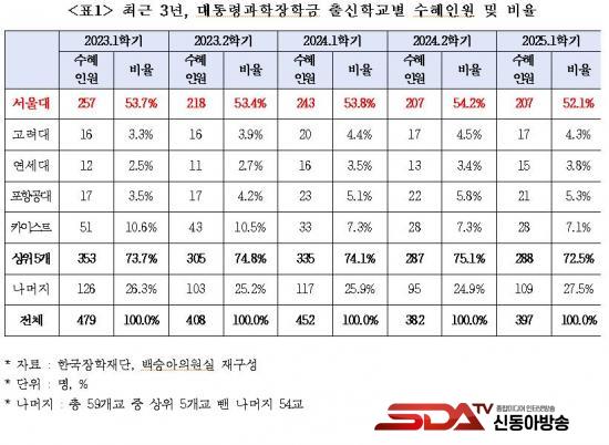 ¡à ±¹È¸ ±³À°À§¿øÈ¸ ¹é½Â¾Æ ÀÇ¿ø(´õºÒ¾î¹ÎÁÖ´ç)ÀÌ Çѱ¹ÀåÇÐÀç´ÜÀ¸·ÎºÎÅÍ Á¦Ãâ¹ÞÀº ¡®±¹°¡¿ì¼öÀåÇÐ±Ý ¼öÇý ÇöȲ¡¯ ÀÚ·á¿¡ µû¸£¸é, ¿ÃÇØ 1Çб⠴ëÅë·É°úÇÐÀåÇбÝÀ» ¹ÞÀº 397¸í Áß °ú¹ÝÀÎ 207¸í(52.1%)ÀÌ ¼¿ï´ë»ýÀ̾ú´Ù. ¼¿ï´ë ´ÙÀ½À¸·Î ¼öÇýÇлýÀÌ ¸¹Àº Ä«À̽ºÆ®(28¸í¡¤7.1%)º¸´Ù 179¸íÀ̳ª ¸¹¾Æ ¼¿ï´ë·ÎÀÇ ÀåÇÐ±Ý ¼öÇý ½ò¸²ÀÌ Å« °ÍÀ¸·Î ³ªÅ¸³µ´Ù.