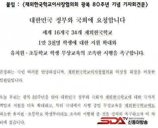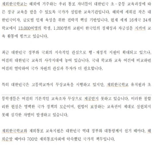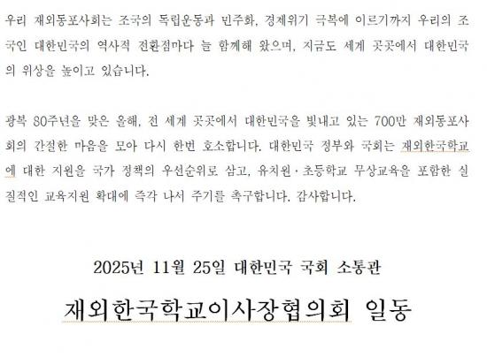 ¡à ÀÌ¿¡ Àç¿ÜÇѱ¹Çб³ÀÌ»çÀåÇùÀÇȸ(ÀÌ»óö ȸÀ塤Áß±¹ ¼ÒÁÖÇѱ¹Çб³ ÀÌ»çÀå)´Â ±âÀÚȸ°ß¿¡¼­ ¡°Àç¿ÜÇѱ¹Çб³¿Í Àç¿Üµ¿Æ÷ ±³À°Áö¿øÀº ´ëÇѹα¹ ¿ª´ë Á¤ºÎ¿Í ´ëÅë·É²²¼­ ÇØ¿Ü ¼ø¹æ ¶§¸¶´Ù 700¸¸ Àç¿Üµ¿Æ÷»çȸ¿¡ ¾à¼ÓÇØ ¿Â ±¹°¡Àû Ã¥¹«¡±¶ó¸ç ¡°À¯Ä¡¿ø°ú ÃʵîÇб³ºÎÅÍ ´Ü°èÀûÀ¸·Î ¹«»ó±³À°¡¤¹«»ó±Þ½ÄÀ» µµÀÔÇϰí, ³ëÈÄÈ­µÈ ±³À°È¯°æÀ» ȹ±âÀûÀ¸·Î °³¼±ÇÏ´Â µî Àç¿ÜÇѱ¹Çб³¿Í Àç¿Üµ¿Æ÷±³À°ÀÌ ³»½ÇÀÖ°Ô ¿î¿µµÉ ¼ö ÀÖµµ·Ï Á¤ºÎ¿Í ±¹È¸°¡ Àû±ØÀûÀ¸·Î ³ª¼­´Þ¶ó¡±°í Ã˱¸Çß´Ù.
