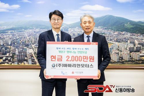 [½Åµ¿¾Æ¹æ¼Û ÀÎõ=À±¹Î½Ä±âÀÚ]ÀÎõ±¤¿ª½Ã °è¾ç±¸(±¸Ã»Àå À±È¯)´Â ¢ß¹Ù¹Ù¸®¾È¸ðÅͽº(´ëÇ¥ ±èȯÁø)·ÎºÎÅÍ Áö³­ 12¿ù 31ÀÏ, Áö¿ª ³» Ãë¾à°èÃþ Áö¿øÀ» À§ÇÑ ¼º±Ý 2,000¸¸ ¿øÀ» ±âŹ ¹Þ¾Ò´Ù°í ¹àÇû´Ù.