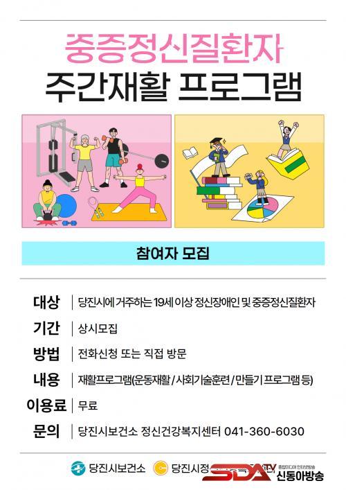 ´çÁø½Ã¹Î Áß Á¤½Å°ú ¾à¹°À» º¹¿ëÇϰí ÀçȰ¿¡ ´ëÇÑ ÀÇÁö°¡ ÀÖ´Ù¸é ´©±¸³ª Âü¿©ÇÒ ¼ö ÀÖÀ¸¸ç, ´çÁø½Ãº¸°Ç¼Ò Á¤½Å°Ç°­º¹Áö¼¾ÅÍ(¢Ï360-6030)·Î ÀüÈ­Çϰųª ¹æ¹®ÇØ ½ÅûÇÒ ¼ö ÀÖ´Ù. ÀÚ¼¼ÇÑ »çÇ×Àº ´çÁø½ÃÁ¤½Å°Ç°­º¹Áö¼¾ÅÍ ´©¸®Áý(http://dangjin.chmhc.or.kr)À» Âü°íÇÏ¸é µÈ´Ù.