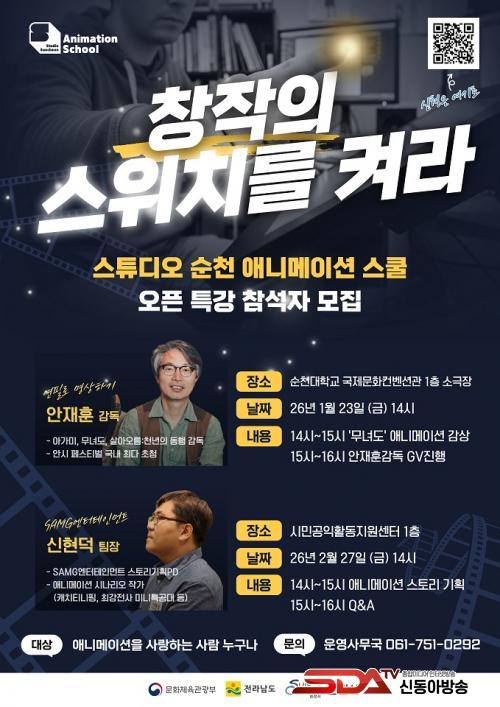 [½Åµ¿¾Æ¹æ¼Û ¼øÃµ=±è¿ëÈÆ ±âÀÚ] ¼øÃµ½Ã´Â ¹®È­ÄÜÅÙÃ÷ Àη¾缺À» À§ÇÑ ¾ÆÄ«µ¥¹ÌÀÎ ¡®½ºÆ©µð¿À ¼øÃµ(Studio Suncheon), À¥Å÷¡¤¾Ö´Ï¸ÞÀÌ¼Ç ½ºÄ𡯿¡¼­ 1¿ùºÎÅÍ 3¿ù±îÁö ¿ÀÇÂÆ¯°­À» ¿î¿µÇÑ´Ù°í ¹àÇû´Ù.
