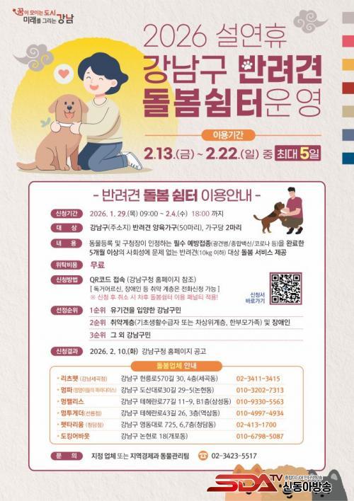 [½Åµ¿¾Æ¹æ¼Û °­³²±¸=À̽ŵ¿±âÀÚ] ²ÞÀÌ ¸ðÀÌ´Â µµ½Ã, ¹Ì·¡¸¦ ±×¸®´Â °­³²±¸°¡ ¼³ ¿¬ÈÞ ±â°£ ¾È½ÉÇÏ°í ¹Ý·Á°ßÀ» ¸Ã±æ ¼ö ÀÖ´Â ¡®¹Ý·Á°ß µ¹º½ ½°ÅÍ¡¯¸¦ ¿î¿µÇÑ´Ù. Á¢¼ö´Â 1¿ù 29ÀϺÎÅÍ 2¿ù 4ÀϱîÁö ÁøÇàÇϸç, ¼±Á¤µÈ ¹Ý·Á°ßÀº 2¿ù 13ÀϺÎÅÍ 22ÀÏ »çÀÌ ÃÖ´ë 5Àϰ£ ¹«·á·Î µ¹º½ ¼­ºñ½º¸¦ ÀÌ¿ëÇÒ ¼ö ÀÖ´Ù.