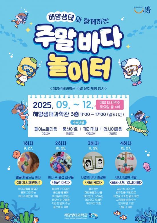 [½Åµ¿¾Æ¹æ¼Û ½ÃÈï½Ã=À̽ŵ¿±âÀÚ] ½ÃÈï½Ã´Â 9¿ùºÎÅÍ 12¿ù±îÁö ¸Å¿ù ¸¶Áö¸· ÁÖ Åä¿äÀÏ, ÇØ¾ç»ýŰúÇаü 3Ãþ ±âȹÀü½Ã½Ç¿¡¼­ ÃÑ 4ȸ¿¡ °ÉÃÄ ÁÖ¸» ¹®È­Ã¼Çè Çà»ç¸¦ ¿î¿µÇÑ´Ù. À̹ø Çà»ç´Â ¡®Çؾç»ýÅÂ¿Í ÇÔ²²ÇÏ´Â ÁÖ¸» ¹Ù´Ù ³îÀÌÅÍ¡¯¸¦ ÁÖÁ¦·Î °¡Á· ´ÜÀ§ °ü¶÷°´ÀÌ ÇÔ²² Áñ¡¦