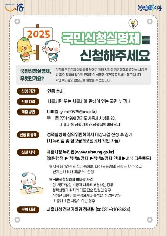 [½Åµ¿¾Æ¹æ¼Û ½ÃÈï½Ã=À̽ŵ¿±âÀÚ] ½ÃÈï½Ã´Â Á¤Ã¥ÀÇ Åõ¸í¼º°ú Ã¥ÀÓ¼ºÀ» °­È­Çϱâ À§ÇØ 2025³âµµ Á¤Ã¥ ½Ç¸íÁ¦¸¦ ½ÃÇàÇϰí, ¾Æ¿ï·¯ ÀÌÀÇ ÀÏȯÀ¸·Î ±¹¹Î ¼ö¿ä¸¦ ¹Ý¿µÇÑ ¡®±¹¹Î½Åû½Ç¸íÁ¦¡¯¸¦ »ó½Ã ¿î¿µÇÑ´Ù. Á¤Ã¥ ½Ç¸íÁ¦´Â ÁÖ¿ä Á¤Ã¥ °áÁ¤°ú ÁýÇà°úÁ¤¿¡¼­ ´ã´çÀÚÀÇ ½Ç¸í°ú¡¦