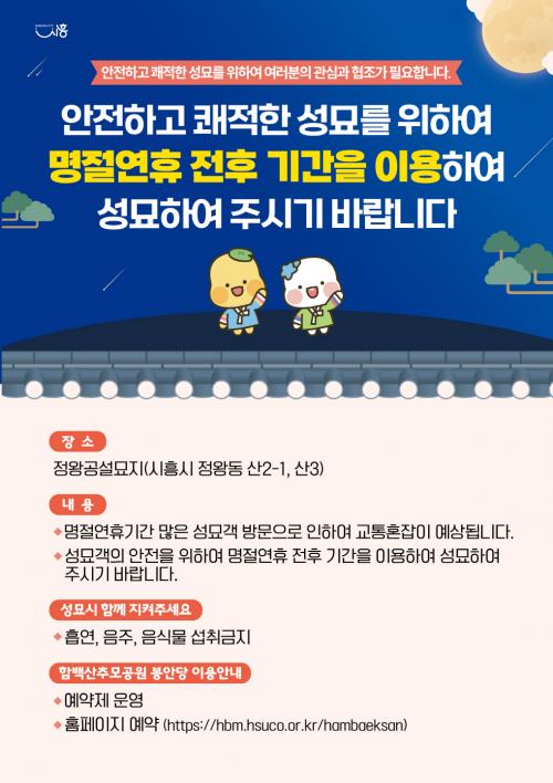 [½Åµ¿¾Æ¹æ¼Û ½ÃÈï½Ã=À̽ŵ¿±âÀÚ] ½ÃÈï½Ã´Â Ãß¼® ¿¬ÈÞ¸¦ ¾ÕµÎ°í ¼º¹¦°´ ÁýÁß¿¡ µû¸¥ ¾ÈÀü»ç°í¸¦ ¿¹¹æÇϰí, ½Ã¹Î ÆíÀǸ¦ ³ôÀ̱â À§ÇØ ¸íÀý ¿¬ÈÞ ÀüÈÄ ¿©À¯ ¼º¹¦ Ä·ÆäÀÎÀ» ÃßÁøÇϰí ÀÖ´Ù. Á¤¿Õ°ø¼³¹¦Áö(Á¤¿Õµ¿ »ê2-1, »ê 3)´Â ½ÃÈï½Ã À¯ÀÏÀÇ °ø¼³¹¦Áö·Î, ¸íÀý ´çÀϸ¶´Ù ¡¦