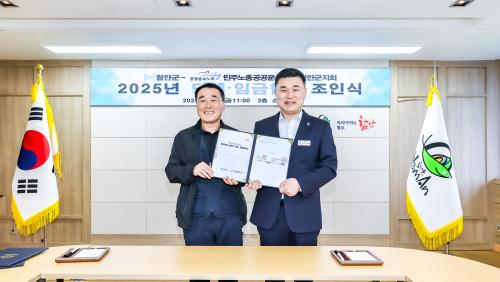 [½Åµ¿¾Æ¹æ¼Û °æ³²ÇÔ¾È=À̽ŵ¿±âÀÚ] ÇԾȱºÀº ¹ÎÁÖ³ëÃÑ °ø°ø¿î¼ö³ëÁ¶ »çȸ¼­ºñ½º³ëµ¿Á¶ÇÕ Àü±¹ÀÚÄ¡´Üü°ø¹«Á÷º»ºÎ ¿ï»ê°æ³²Áö¿ªÁöºÎ ÇԾȱºÁöȸ(ÀÌÇÏ °ø¹«Á÷³ëÁ¶)¿Í Áö³­ 10¿ù 31ÀÏ ¿ÀÀü 11½Ã ±ºÃ»¿¡¼­ ´Üü ¹× ÀÓ±ÝÇù¾à Á¶ÀνÄÀ» °¡Á³´Ù°í ¹àÇû´Ù. À̳¯ Á¶ÀνĿ¡´Â ¡¦