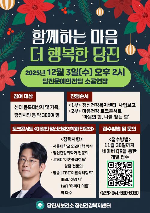 [½Åµ¿¾Æ¹æ¼Û=ÀÌÀçö±âÀÚ] ´çÁø½Ãº¸°Ç¼Ò(¼ÒÀå ¹ÚÁ¾±Ô)´Â ¿À´Â 12¿ù 3ÀÏ ¿ÀÈÄ 2½Ã ´çÁø¹®¿¹ÀÇÀü´ç ¼Ò°ø¿¬Àå¿¡¼­ 2025³â Á¤½Å°Ç°­º¹Áö¼¾ÅÍ »ç¾÷ º¸°íȸ ¹× ¸¶À½°Ç°­ ÅäÅ©Äܼ­Æ®¸¦ °³ÃÖÇÑ´Ù°í 20ÀÏ ¹àÇû´Ù. À̹ø Çà»ç´Â Á¤½Å°Ç°­¿¡ °ü½ÉÀÌ ÀÖ´Â ½Ã¹ÎµéÀÌ ÇÑÀÚ¸®¿¡ ¸ð¿© Á¤¡¦