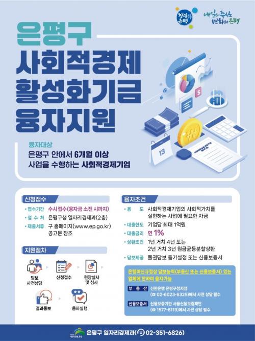 [½Åµ¿¾Æ¹æ¼Û ÀºÆò±¸=À̽ŵ¿±âÀÚ] ¼­¿ï ÀºÆò±¸´Â »çȸÀû°æÁ¦±â¾÷ÀÇ ¼ºÀå°ú °æ¿µ ¾ÈÁ¤À» µ½±â À§ÇØ ¡®»çȸÀû°æÁ¦È°¼ºÈ­±â±Ý À¶ÀÚ Áö¿ø»ç¾÷¡¯À» ½Ç½ÃÇÑ´Ù°í ¹àÇû´Ù. À̹ø »ç¾÷Àº 6°³¿ù ÀÌ»ó »ç¾÷À» ¼öÇàÇÏ´Â ÀºÆò±¸ ¼ÒÀç »çȸÀû°æÁ¦±â¾÷À» ´ë»óÀ¸·Î Çϸç, ±â¾÷´ç ÃÖ´ë 1¡¦