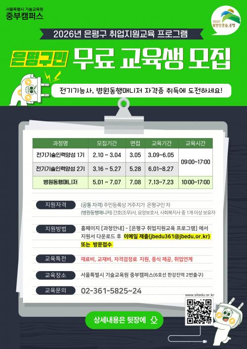 [½Åµ¿¾Æ¹æ¼Û ÀºÆò±¸=À̽ŵ¿±âÀÚ] ¼­¿ï ÀºÆò±¸´Â ±¸¹ÎÀÇ Ãë¾÷¿ª·® °­È­¸¦ À§ÇØ ¡®2026³â ÀºÆò±¸ Ãë¾÷Áö¿ø±³À° ÇÁ·Î±×·¥¡¯ ±³À°»ýÀ» ¸ðÁýÇÑ´Ù°í ¹àÇû´Ù. À̹ø ÇÁ·Î±×·¥Àº ¼­¿ï½Ã ±â¼ú±³À°¿ø ÁߺÎÄ·ÆÛ½º¿Í Çù¾àÀ» ÅëÇØ ÃßÁøÇÏ´Â À§Å¹ Á÷¾÷ÈÆ·Ã °úÁ¤À¸·Î, ½Ç¹« Á᫐ ±³À°¡¦