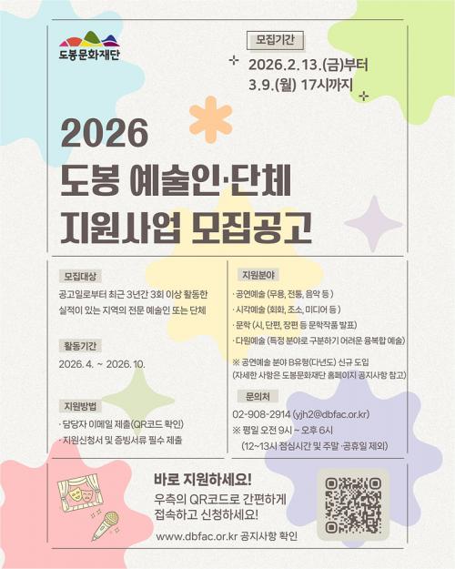 [½Åµ¿¾Æ¹æ¼Û µµºÀ±¸=À̽ŵ¿±âÀÚ] ¼­¿ï µµºÀ±¸ µµºÀ¹®È­Àç´ÜÀÌ ¿À´Â 3¿ù 9ÀϱîÁö ¡®2026 µµºÀ ¿¹¼úÀΡ¤´Üü Áö¿ø»ç¾÷¡¯ °ø¸ð¸¦ ÁøÇàÇÑ´Ù. ¡®µµºÀ ¿¹¼úÀΡ¤´Üü Áö¿ø»ç¾÷¡¯Àº µµºÀ±¸¸¦ ±â¹ÝÀ¸·Î Ȱµ¿ÇÏ´Â ¿¹¼úÀΰú ´ÜüÀÇ Ã¢ÀÛ ¿ª·®À» °­È­Çϰí, Áö¿ª ³» Áö¼Ó °¡´ÉÇÑ ¹®¡¦