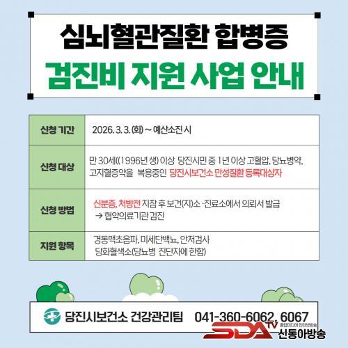 [½Åµ¿¾Æ¹æ¼Û=ÀÌÀçö±âÀÚ] ´çÁø½Ã´Â Áö¿ª ÁÖ¹ÎÀÇ ³úÁ¹Áß, ÇãÇ÷¼º ½ÉÀåÁúȯ µî ½É³úÇ÷°üÁúȯÀÇ ¿¹¹æ°ú Á¶±â ¹ß°ßÀ» À§ÇØ ¡®½É³úÇ÷°üÁúȯ ÇÕº´Áõ °ËÁøºñ Áö¿ø »ç¾÷¡¯À» ½Ç½ÃÇÑ´Ù°í 20ÀÏ ¹àÇû´Ù.