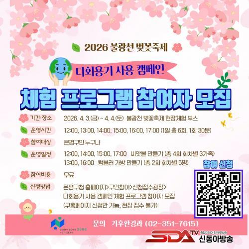 ¸ðµç üÇè ÇÁ·Î±×·¥Àº ÀºÆò±¸Ã» ´©¸®Áý ±¸¹ÎÂü¿©-½ÅûÁ¢¼ö±¤Àå¿¡¼­ »çÀü ½ÅûÀ» ÅëÇØ Âü¿©ÇÒ ¼ö ÀÖ´Ù. Âü¿©ÀÚ ¸ðÁý ±â°£Àº 4¿ù 2ÀϱîÁöÀ̸ç, ÃÑ 100¸íÀ» ¼±Âø¼ø ¸ðÁýÇÑ´Ù.