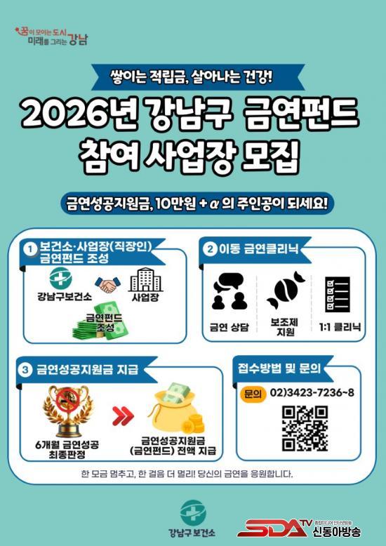 [½Åµ¿¾Æ¹æ¼Û °­³²±¸=À̽ŵ¿±âÀÚ] ²ÞÀÌ ¸ðÀÌ´Â µµ½Ã, ¹Ì·¡¸¦ ±×¸®´Â °­³²±¸°¡ Á÷ÀåÀÎÀÇ ÀÚ¹ßÀûÀÎ ±Ý¿¬ ½ÇõÀ» À¯µµÇÏ°í °£Á¢Èí¿¬ ÇÇÇØ¸¦ ÁÙÀ̱â À§ÇØ ¡®2026³â »ç¾÷Àå ±Ý¿¬ÆÝµå¡¯ Âü¿©±â¾÷À» ¸ðÁýÇÑ´Ù. º¸°Ç¼Ò¿Í »ç¾÷Àå, Á÷ÀåÀÎÀÌ ÇÔ²² ±Ý¿¬ÆÝµå¸¦ Á¶¼ºÇϰí, 6°³¿ù ±Ý¿¬¿¡ ¼º°øÇϸé Àû¸³±Ý Àü¾×À» Áö¿ø±ÝÀ¸·Î µ¹·ÁÁÖ´Â ¹æ½ÄÀÌ´Ù.