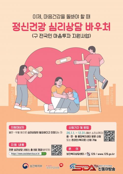 ÀÌ »ç¾÷Àº Á¤¼­Àû ¾î·Á¿òÀÌ ÁßÁõ Á¤½ÅÁúȯÀ¸·Î ¾ÇÈ­Çϱâ Àü¿¡ Á¶±â¿¡ Àü¹® »ó´ãÀ» ¹ÞÀ» ¼ö ÀÖµµ·Ï µ½±â À§ÇÑ °ÍÀÌ´Ù. ±¸¹ÎÀº Àü¹® ½É¸®»ó´ã¼¾ÅÍ¿¡¼­ 1´ë1 ´ë¸é »ó´ãÀ» ÃÑ 8ȸ ¹ÞÀ» ¼ö ÀÖÀ¸¸ç, ȸ´ç ÃÖ´ë 8¸¸ ¿ø, ÃÑ 64¸¸ ¿ø±îÁö Áö¿øµÈ´Ù.