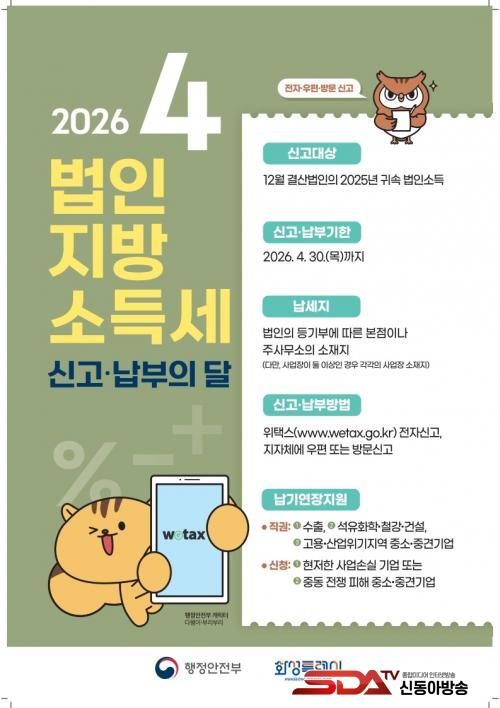 ¹ýÀÎÁö¹æ¼Òµæ¼¼´Â ¹ýÀÎÀÌ ÇØ´ç »ç¾÷¿¬µµ ¼ÒµæÀ» ±âÁØÀ¸·Î °üÇÒ ½Ã¡¤±º¡¤±¸¿¡ ½Å°í¡¤³³ºÎÇÏ´Â ¼¼±ÝÀÌ´Ù. È­¼º½Ã °ü³»¿¡ »ç¾÷ÀåÀ» µÐ 2025³â 12¿ù °á»ê ¹ýÀÎ Áß ¹ýÀμ¼¹ý¿¡ µû¸¥ ³³¼¼Àǹ«°¡ ÀÖ´Â ¹ýÀÎÀº ¿À´Â 4¿ù 30ÀϱîÁö °ú¼¼Ç¥ÁØ ¹× ¼¼¾×À» ½Å°íÇÏ°í ³³ºÎÇØ¾ß ÇÑ´Ù.