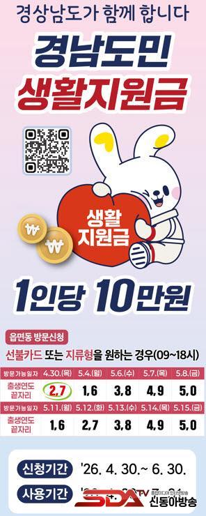 Áö¿ø±Ý¾×Àº ½Ã¹Î 1Àδç 10¸¸¿øÀÌ´Ù. ½ÅûÀº ¿À´Â 30ÀϺÎÅÍ 6¿ù 30ÀϱîÁö µÎ ´Þ°£ ÁøÇàµÈ´Ù. ½Åû ¹æ¹ýÀº ¿Â¶óÀΰú ¿ÀÇÁ¶óÀÎ Áß ¼±ÅÃÇÒ ¼ö ÀÖ´Ù. ¡ã¿Â¶óÀÎ ½ÅûÀº Àü¿ë ´©¸®Áý(°æ³²µµ¹Î»ýȰÁö¿ø±Ý.kr)À» ÅëÇØ ³óÇù,°æ³²ÀºÇà ½Å¿ë¡¤Ã¼Å©Ä«µå ÃæÀüÀ̳ª ¸ð¹ÙÀÏ ÁøÁÖ»ç¶û»óǰ±ÇÀ¸·Î ¹ÞÀ» ¼ö ÀÖÀ¸¸ç, ½Åû ÈÄ 1~3ÀÏ À̳»¿¡ Áö±ÞµÈ´Ù. ¡ã¿ÀÇÁ¶óÀÎ ½ÅûÀº ÁÖ¼ÒÁö À¾¸é»ç¹«¼Ò ¹× ÇàÁ¤º¹Áö¼¾Å͸¦ ¹æ¹®ÇØ ¼±ºÒÄ«µå³ª Áö·ù ÁøÁÖ»ç¶û»óǰ±ÇÀ¸·Î ¼ö·É °¡´ÉÇÏ´Ù.