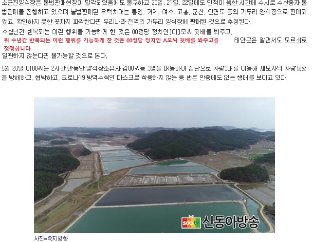 ¼Ò±ÙÁø¾ç½ÄÀåÀº ºÒ¹ýÆÇ¸ÅÇöÀåÀÌ ¹ß°¢µÇ¾úÀ½¿¡µµ ºÒ±¸Çϰí 20ÀÏ, 21ÀÏ, 22ÀÏ¿¡µµ ÀÎÀûÀÌ ¶äÇÑ ½Ã°£¿¡ ¼ö½Ã·Î ¼ö»êÁ¾ÀÚ ºÒ¹ýÆÇ¸Å¸¦ ÁøÇàÇϰí ÀÖÀ¸¸ç ºÒ¹ýÆÇ¸ÅµÈ ¿ì·°Ä¡¾î´Â Å뿵, °ÅÁ¦, ¿©¼ö, °íÈï, ±º»ê, ¾È¸éµµ µîÀÇ °¡µÎ¸® ¾ç½ÄÀåÀ¸·Î ÆÇ¸ÅµÇ¾ú°í, È®ÀÎÇÏÁö ¸øÇÑ °÷±îÁö ÆÄ¾ÇÇÑ´Ù¸é ¿ì¸®³ª¶ó Àü¿ªÀÇ °¡µÎ¸® ¾ç½ÄÀå¿¡ ÆÇ¸ÅµÈ °ÍÀ¸·Î ÃßÁ¤µÈ´Ù.
