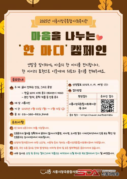 ¼±Á¤µÈ ¹®ÀåÀº ³»ºÎ ½É»ç¸¦ °ÅÃÄ Ä¶¸®±×·¡ÇÇ ÀÛǰÀ¸·Î Á¦À۵Ǹç, ¿À´Â 12¿ù ½ÃÈï½ÃÀå°îÁ¾ÇÕ»çȸº¹Áö°ü º¹µµ°¶·¯¸®¿¡¼ Àü½ÃµÈ´Ù. Àü½ÃµÈ ÀÛǰÀº ½Ã¹Îµé¿¡°Ô ÇÑ ÇØ¸¦ µû¶æÇÏ°Ô ¸¶¹«¸®ÇÒ ¼ö ÀÖ´Â ÀÛÀº À§·ÎÀÇ ¸Þ½ÃÁö·Î Àü´ÞµÉ Àü¸ÁÀÌ´Ù.