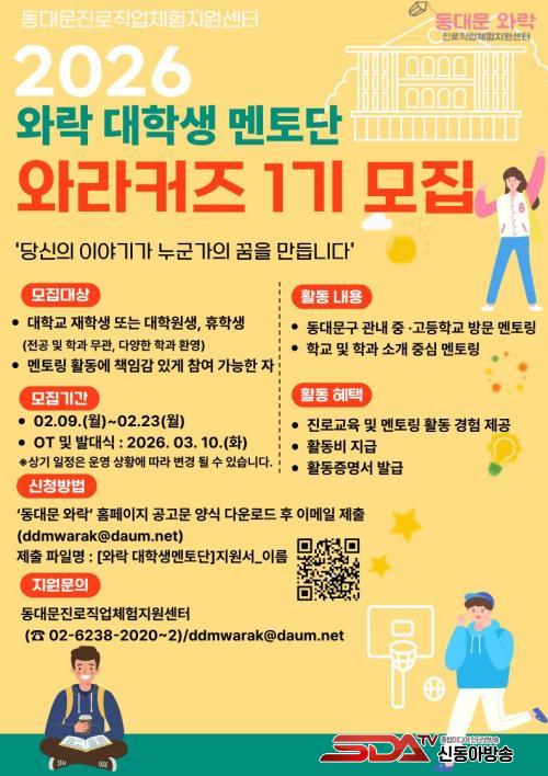 [½Åµ¿¾Æ¹æ¼Û µ¿´ë¹®±¸=À̽ŵ¿±âÀÚ] µ¿´ë¹®±¸°¡ À§Å¹ ¿î¿µÇÏ´Â Áø·ÎÁ÷¾÷üÇèÁö¿ø¼¾ÅÍ ¿Í¶ô(ÀÌÇÏ ¿Í¶ô)Àº µ¿´ë¹®±¸ û¼Ò³âµéÀÇ Áø·Î Ž»öÀ» Áö¿øÇϱâ À§ÇØ ¸àÅä´Ü ¡¸¿Í¶óÄ¿Áî(WARAKERS)¡¹ 1±â¸¦ °ø°³ ¸ðÁýÇÑ´Ù. ¿Í¶óÄ¿Áî(WARAKERS)´Â ¡®¿Í¶ô(WARAK)¡¯°ú ¡®-ers¡¯¸¦ °áÇÕÇÑ ¸íĪÀ¸·Î, ¿Í¶ô°ú ÇÔ²² û¼Ò³âÀÇ Áø·Î ¼ºÀåÀ» À̲ø¾î°¡´Â »ç¶÷µéÀ» ÀǹÌÇÑ´Ù.