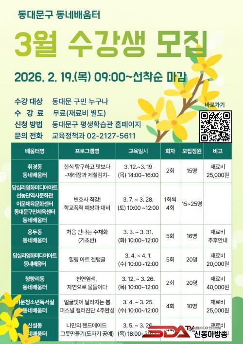 ¼ö°À» Èñ¸ÁÇÏ´Â ±¸¹ÎÀº µ¿´ë¹®±¸ Æò»ýÇнÀ°ü ´©¸®Áý(ddm.go.kr/lll/index.do)À» ÅëÇØ ½ÅûÇÏ¸é µÇ¸ç, µðÁöÅÐ ¹®Çر³À° ¹× ±âÃÊÇѱ۱³½ÇÀÇ °æ¿ì´Â µ¿´ë¹®±¸ Æò»ýÇнÀ°ü(µ¿´ë¹®±¸ ¿Õ»ê·Î 128)À¸·Î ¹æ¹®ÇÏ¿© ½ÅûÇÒ ¼ö ÀÖ´Ù.