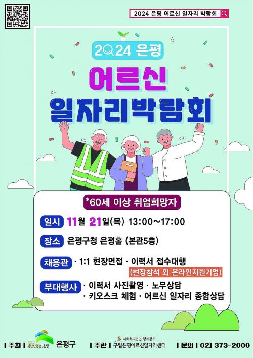 [½Åµ¿¾Æ¹æ¼Û ÀºÆò±¸=À̽ŵ¿±âÀÚ] ÀºÆò±¸´Â ¿À´Â 21ÀÏ ¿ÀÈÄ 1½ÃºÎÅÍ 5½Ã±îÁö ÀºÆò±¸Ã» 5Ãþ ÀºÆòȦ¿¡¼­ ¡®2024³â ÀºÆò¾î¸£½ÅÀÏÀÚ¸® ¹Ú¶÷ȸ¡¯¸¦ °³ÃÖÇÑ´Ù°í ¹àÇû´Ù. ¿ÃÇØ·Î 3³â°¸¦ ¸ÂÀÌÇÏ´Â À̹ø ¹Ú¶÷ȸ´Â Áõ°¡ÇÏ´Â 60¼¼ ÀÌ»óÀÇ ±¸Á÷ÀÚ¿¡°Ô ÀçÃë¾÷ ±âȸ¿Í ´Ù¾çÇÑ Ãë¾÷ ¡¦