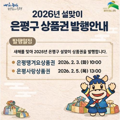 [½Åµ¿¾Æ¹æ¼Û ÀºÆò±¸=À̽ŵ¿±âÀÚ] ¼­¿ï ÀºÆò±¸´Â ¼³ ¸íÀýÀ» ¸Â¾Æ ¿À´Â 2¿ù ù° ÁÖ¿¡ ÀºÆò¶¯°Ü¿ä»óǰ±Ç°ú ÀºÆò»ç¶û»óǰ±ÇÀ» ¹ßÇàÇÑ´Ù°í ¹àÇû´Ù. ÀºÆò¶¯°Ü¿ä»óǰ±ÇÀº ³»´Þ 3ÀÏ ¿ÀÀü 10½ÃºÎÅÍ 1¾ï 5õ¸¸ ¿ø ±Ô¸ð·Î ÆÇ¸ÅÇÑ´Ù. ÀºÆò»ç¶û»óǰ±ÇÀº ³»´Þ 5ÀÏ ¿ÀÈÄ 1½ÃºÎÅÍ 5¡¦