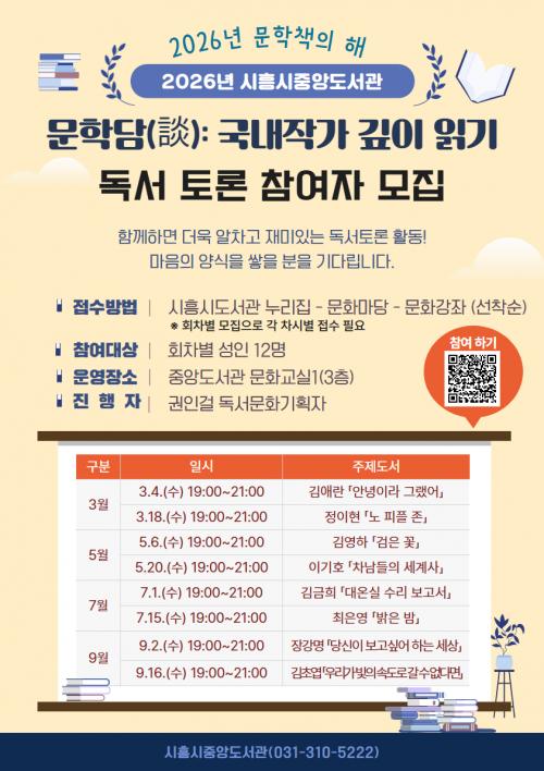 [½Åµ¿¾Æ¹æ¼Û ½ÃÈï½Ã=À̽ŵ¿±âÀÚ] ½ÃÈï½ÃÁß¾Óµµ¼­°üÀº ¡®2026³â ¹®ÇÐÃ¥ÀÇ ÇØ¡¯¸¦ ¸Â¾Æ ±¹³» ´ëÇ¥ ¹®ÇÐ ÀÛ°¡ ¼Ò¼³À» ÁÖÁ¦·Î ÇÑ µ¶¼­Åä·Ð ¡®¹®Çдã(ÓÈ): ±¹³» ÀÛ°¡ ±íÀÌ Àб⡯¸¦ ¿À´Â 3¿ùºÎÅÍ 9¿ù±îÁö ¿î¿µÇÑ´Ù. À̹ø µ¶¼­Åä·ÐÀº ¹®ÇÐ ÀÛǰÀ» ¸Å°³·Î Âü°¡ÀÚµéÀÌ ¼­·ÎÀÇ¡¦