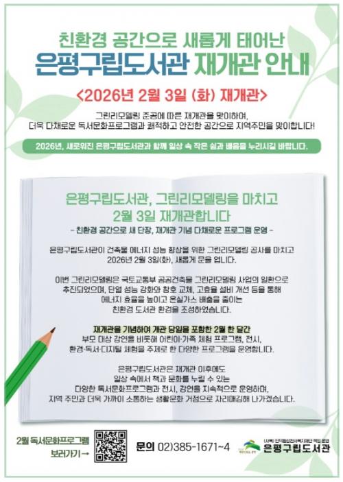 [½Åµ¿¾Æ¹æ¼Û ÀºÆò±¸=À̽ŵ¿±âÀÚ] ¼­¿ï ÀºÆò±¸´Â ÀºÆò±¸¸³µµ¼­°üÀÌ ¾à 9°³¿ù°£ÀÇ ±×¸°¸®¸ðµ¨¸µ °ø»ç¸¦ ¸¶Ä¡°í Áö³­ 3ÀÏ Àç°³°üÇß´Ù°í ¹àÇû´Ù. 2001³â °³°üÇÑ ÀºÆò±¸¸³µµ¼­°üÀº Áö³­ 2023³â ±¹Åä±³ÅëºÎ ÁÖ°ü ¡®°ø°ø°ÇÃ๰ ±×¸°¸®¸ðµ¨¸µ¡¯ °ø¸ð»ç¾÷¿¡ ¼±Á¤µÅ Áö³­ÇØ 5¿ù¡¦