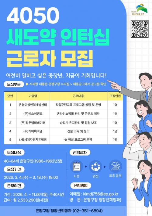 [½Åµ¿¾Æ¹æ¼Û ÀºÆò±¸=À̽ŵ¿±âÀÚ] ¼­¿ï ÀºÆò±¸(±¸Ã»Àå ±è¹Ì°æ)´Â ÁßÀå³âÃþÀÇ ÀçÃë¾÷ ¿ª·® °­È­¸¦ À§ÇØ ¡®2026³â 4050 »õµµ¾à ÀÎÅÏ½Ê ÇÁ·Î±×·¥¡¯ Âü¿©ÀÚ¸¦ ¿À´Â 18ÀϱîÁö ¸ðÁýÇÑ´Ù°í ¹àÇû´Ù. À̹ø »ç¾÷Àº ÁßÀå³âÃþ¿¡°Ô ½Ç¹« °æÇèÀ» Á¦°øÇϰí ÀçÃë¾÷ ¿ª·®À» ³ôÀ̱â À§ÇØ¡¦