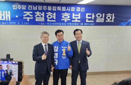 [½Åµ¿¾Æ¹æ¼Û ¿©¼ö=±è±â³² ±âÀÚ] Àü³²¡¤±¤ÁÖ ÅëÇÕÆ¯º°½ÃÀå ¼±°Å¸¦ ¾ÕµÎ°í ´õºÒ¾î¹ÎÁÖ´ç °æ¼±¿¡ ³ª¼± ÁÖöÇö Èĺ¸¿Í ¹ÎÇü¹è Èĺ¸ÀÇ ´ÜÀÏÈ­¿¡ ´ëÇØ ±è¿µ±Ô ¿©¼ö½ÃÀå ¿¹ºñÈ帰¡ 1ÀÏ È¯¿µ ÀÔÀåÀ» ¹àÇû´Ù. ±è ¿¹ºñÈ帴 À̳¯ ÀÔÀå¹®À» Åë·¡ ¡°À̹ø ´ÜÀÏÈ­´Â ´Ü¼øÇÑ Èĺ¸¡¦