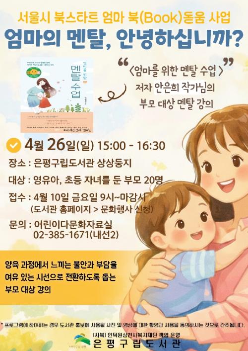[½Åµ¿¾Æ¹æ¼Û ÀºÆò±¸=À̽ŵ¿±âÀÚ] ¼­¿ï ÀºÆò±¸´Â ¿À´Â 26ÀÏ ºÎ¸ðÀÇ ¸¶À½À» µ¹º¸°í °Ç°­ÇÑ ¾çÀ° ¹æÇâÀ» Á¦½ÃÇÏ´Â ÇÁ·Î±×·¥ ¡®¾ö¸¶ÀÇ ¸àÅ», ¾È³çÇϽʴϱî?¡¯¸¦ ¿î¿µÇÑ´Ù°í ¹àÇû´Ù. À̹ø ÇÁ·Î±×·¥Àº ÀºÆò±¸¸³µµ¼­°üÀÌ ¼­¿ï½Ã ºÏ½ºÅ¸Æ® ¡®¾ö¸¶ ºÏ(Book)µ¸¿ò¡¯ »ç¾÷°ú ¿¬°è¡¦