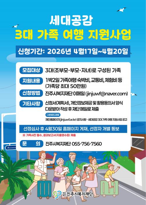 [½Åµ¿¾Æ¹æ¼Û °æ³²ÁøÁÖ=³²±Ã¿µ±â±âÀÚ] ÁøÁֽú¹ÁöÀç´ÜÀº °¡Á·ÀÌ ÇÔ²²ÇÏ´Â ½Ã°£À» ¸¶·ÃÇØ ¼¼´ë °£ °æÇè°ú Á¤¼­¸¦ ³ª´©´Â ±âȸ¸¦ Á¦°øÇϰíÀÚ ¡®¼¼´ë°ø°¨ 3´ë °¡Á· ¿©Çà Áö¿ø»ç¾÷¡¯À» ÃßÁøÇϰí, Âü¿© °¡Á·À» ¸ðÁýÇÑ´Ù°í 7ÀÏ ¹àÇû´Ù. À̹ø »ç¾÷Àº Á¶ºÎ¸ð¡¤ºÎ¸ð¡¤Àڳడ ÇÔ¡¦