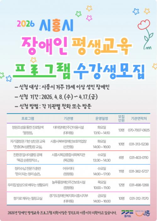 [½Åµ¿¾Æ¹æ¼Û ½ÃÈï½Ã=À̽ŵ¿±âÀÚ] ½ÃÈï½Ã°¡ °ü³» ¼ºÀÎ Àå¾ÖÀÎÀÇ ÇнÀ±Ç º¸Àå°ú »çȸÂü¿© È®´ë¸¦ À§ÇØ ¡®2026³â Àå¾ÖÀÎ Æò»ý±³À° ÇÁ·Î±×·¥ Áö¿ø»ç¾÷¡¯À» º»°ÝÀûÀ¸·Î ½ÃÀÛÇϸç, 4¿ù 8ÀϺÎÅÍ 17ÀϱîÁö ÇÁ·Î±×·¥ ¿î¿µÀ» À§ÇÑ ÇнÀÀÚ¸¦ ¸ðÁýÇÑ´Ù. À̹ø »ç¾÷Àº °æ±âµµ¿Í ½ÃÈ