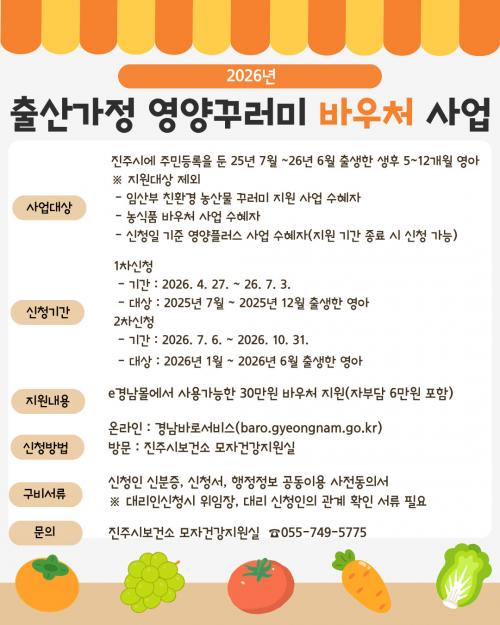 [½Åµ¿¾Æ¹æ¼Û °æ³²ÁøÁÖ=³²±Ã¿µ±â±âÀÚ] ÁøÁֽú¸°Ç¼Ò´Â Ãâ»ê °¡Á¤ÀÇ °æÁ¦Àû ºÎ´ãÀ» ´ú°í ¿µ¾ÆÀÇ °Ç°­ÇÑ ¼ºÀå°ú ¹ß´ÞÀ» Áö¿øÇϱâ À§ÇØ 2026³â ½Å±Ô»ç¾÷ÀÎ ¡®Ãâ»ê°¡Á¤ ¿µ¾ç²Ù·¯¹Ì ¹Ù¿ìó(Voucher) Áö¿ø»ç¾÷¡¯À» ¿À´Â 27ÀϺÎÅÍ ½ÃÇàÇÑ´Ù°í ¹àÇû´Ù. À̹ø »ç¾÷Àº ÁøÁֽÿ¡ ÁÖ¡¦